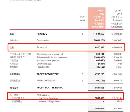 對于農(nóng)夫山泉的上漲離不開公司高達(dá)60%的毛利率。根據(jù)公司中期報告,公司2020年中期毛利69.1億人民幣,毛利率為59.85%,較2019年中期公司毛利率56%再度提升。同時,公司中期實(shí)現(xiàn)凈利28.64億元,凈利率為24.8%。