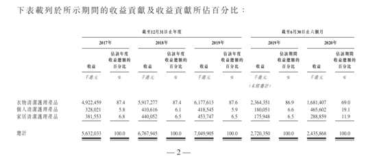 公司是中國(guó)領(lǐng)先的以消費(fèi)者為核心的家庭清潔護(hù)理公司,研發(fā)、生產(chǎn)及銷(xiāo)售多款產(chǎn)品,涵蓋衣物清潔護(hù)理、個(gè)人清潔護(hù)理及家居清潔護(hù)理三大品類(lèi)。根據(jù)弗若斯特沙利文報(bào)告,于2017年、2018年及2019年各年,公司的洗衣液、洗手液及濃縮洗衣液產(chǎn)品在其各自市場(chǎng)的市場(chǎng)份額均排名第一。