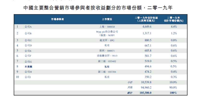 據(jù)弗若斯特沙利文報告,以2019年的收入計,時空視點(diǎn)在內(nèi)地數(shù)字整合營銷解決方案供應(yīng)商中排名第八位,市場份額分別為0.5%及0.5%,市場占有率前三名分別為:藍(lán)色光標(biāo)、WPP集團(tuán)及奧培智,市場占有率分別為:4.4%、1.2%及0.8%。值得一提的是,目前排名前十名參與者僅占市場份額的10.0%,其余部分由約1000名中小型市場參與者分享。