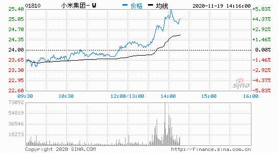 摘要: 查看最新行情新浪科技訊11月19日下午消息,小米集團(tuán)港股短線拉升,截至發(fā)稿,漲幅超4%,報(bào)25.2港元,市值約6069.7億港元。