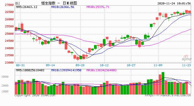 摘要: 11月24日消息,道瓊斯指數(shù)漲327.79點(diǎn),漲幅1.12%,報(bào)29591.27點(diǎn),香港第四波疫情發(fā)酵。港股恒指今日高開0.54%,報(bào)26630.34點(diǎn);國企指數(shù)漲0.41%,紅籌指數(shù)跌0.16%。