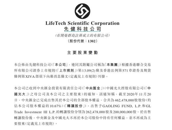 11月24日,謎底揭曉:據(jù)港交所披露,高瓴于11月20日買入2.62478億股先健科技(1302.HK),平均代價為2.3港元/股,涉資約6億港元,買入后高瓴持股數(shù)占先健科技總股本的比例為6.06%。