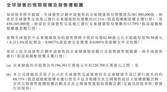 11月26日早間消息,京東集團(tuán)今日在港交所公告,京東健康已于2020年11月26日就擬議分拆及全球發(fā)售刊發(fā)招股章程。如招股章程所披露,全球發(fā)售計劃申請發(fā)售的京東健康股份總數(shù)將為381900000股,相當(dāng)于全球發(fā)售完成后已發(fā)行京東健康股份總數(shù)約為12.21%(假設(shè)超額配股權(quán)未獲行使),及439185000股,相當(dāng)于全球發(fā)售完成后已發(fā)行京東健康股份總數(shù)月為13.79%(假設(shè)超額配股權(quán)獲悉數(shù)行使)。公告稱,京東健康的市值將為196381百萬港元至220709百萬港元之間;京東通過全資子公司于全球發(fā)售完成后將持有京東健康全部已發(fā)行股本的約68.73%。