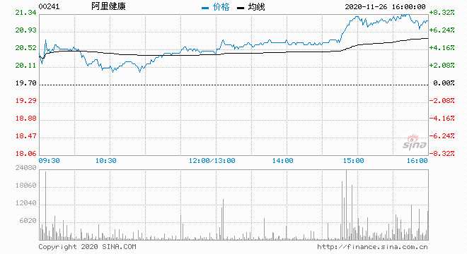 摘要: 昨日公布業(yè)績的阿里健康(0241.HK)今日高開高走,盤中一度漲8.38%報21.35港元,市值超2800億港元。