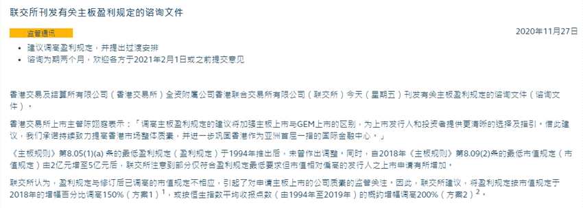 摘要: 27日,港交所在網(wǎng)站刊發(fā)了有關(guān)赴港上市主板公司盈利規(guī)定的咨詢文件。