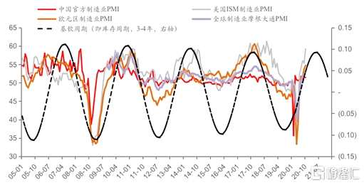 拋開經(jīng)濟(jì)周期來談周期品的投資邏輯,是十分不現(xiàn)實(shí)的。從宏觀層面來看,根據(jù)全球制造業(yè)PMI指數(shù),本輪周期的起始點(diǎn)在2019Q2附近。但上升周期被疫情打斷,隨之PMI指數(shù)跌至冰點(diǎn)。隨著3月份經(jīng)濟(jì)開始重啟,PMI重新進(jìn)入了上行通道。目前,海外疫苗消息利好不斷,全球制造業(yè)PMI總體預(yù)計(jì)將繼續(xù)走高。