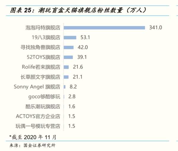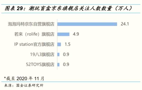 從線上渠道覆蓋、銷售額及運營能力來看,泡泡瑪特表現(xiàn)均優(yōu)于其他競品品牌。線上渠道覆蓋更為全面,且布局時間早。泡泡瑪特會員在線上線下全渠道打通,天貓旗艦店粉絲數(shù)達到 340萬人,京東自營旗艦店關(guān)注人數(shù)達到 24.1 萬人,遠超其余潮玩盲盒旗艦店,優(yōu)勢明顯。