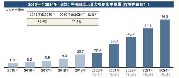 據(jù)弗若斯特沙利文預(yù)估,2019 年潮流玩具市場規(guī)模約 207 億元,2019-2024年復(fù)合增長率約為 29.8%,仍處于行業(yè)高速增長期。