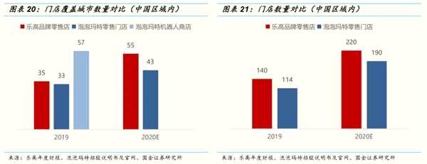 依據(jù)樂高年報,2019 年樂高在中國門店數(shù)達 140 家,預(yù)計 2020 年增值 220 家。對比樂高的門店數(shù)量及城市覆蓋情況,潮流玩具龍頭企業(yè)泡泡瑪特與之差距不大。