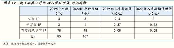 以泡泡瑪特為例,將 IP按照收入貢獻分為億級、千萬級、百萬級及以下三檔,若按照 50%的收入增速計算,2020 年億級 IP 和千萬級 IP 均需要各增一員。