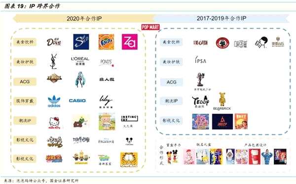潮玩盲盒通過跨界合作不斷豐富 IP的內(nèi)容與形式,跨界合作讓產(chǎn)品在特定消費場景共享多個品牌多維度的流量,實現(xiàn)熱度的延續(xù)。