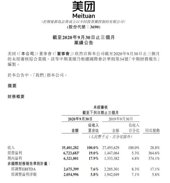 美團:2020第三季度凈利潤63.2億元 市場預期5.71億元