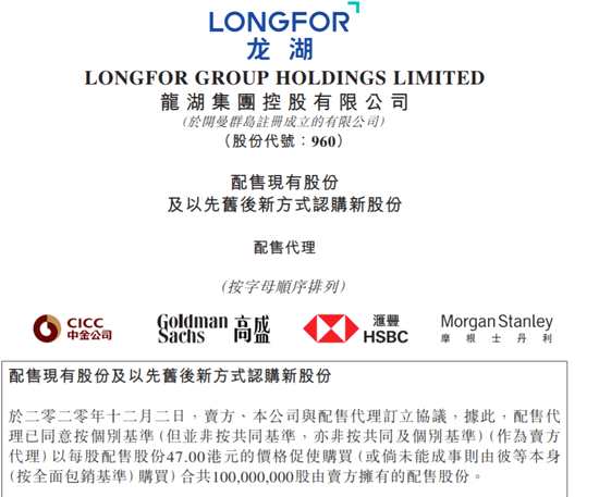 龍湖集團實控人配售1億股 承配人同意認(rèn)購0.5億股籌資23.5億