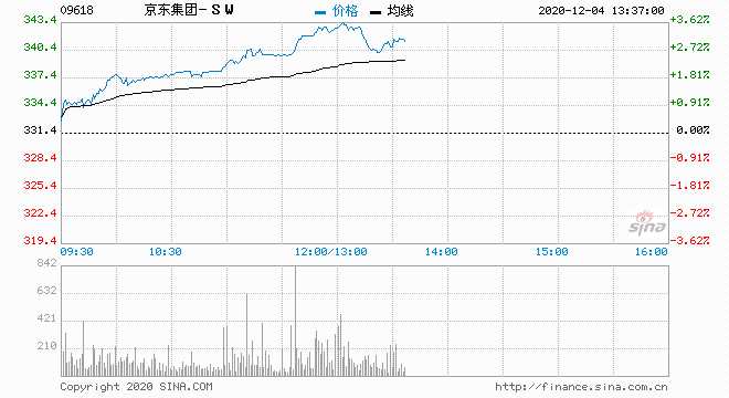 京東集團(tuán)-SW(09618.HK)高開高走,現(xiàn)漲逾3%,報(bào)341港元,總市值10691億港元。
