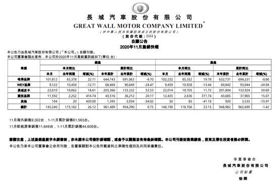 12月7日消息,長(zhǎng)城汽車發(fā)布2020年11月產(chǎn)銷快報(bào),銷量14.524萬輛,同比增長(zhǎng)26.12%;產(chǎn)量14.619萬輛,同比增長(zhǎng)23.15%。1-11月,累計(jì)銷量961,489輛,同比增長(zhǎng)0.75%;累計(jì)產(chǎn)量948,982輛,同比下降1.42%。