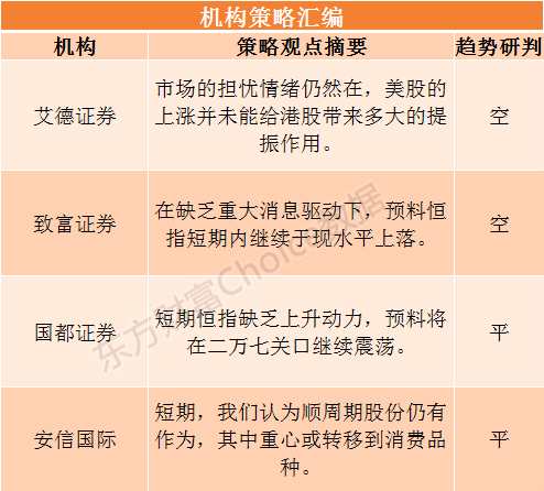國都證券指出,市場憂慮外圍局勢,投資者觀望情緒升溫,同時香港本地的疫情仍未受控,香港本地股料繼續(xù)承壓,或拖累大市的走勢,短期恒指缺乏上升動力,預(yù)料將在二萬七關(guān)口繼續(xù)震蕩。