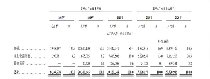 快手的主要業(yè)務(wù)有直播服務(wù)、線上銷售服務(wù)、以及其他服務(wù)三大業(yè)務(wù)。其中,直播服務(wù)是快手的營(yíng)收主力。招股書顯示,2017年至2020年上半年,直播收入分別為79億元、186億元、314億元及173億元,分別占總收入的95.3%、91.7%、80.4%及68.5%。