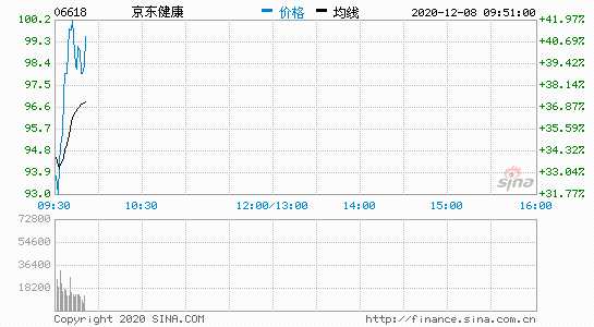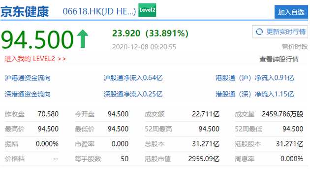 摘要: 查看最新行情新浪科技訊12月8日上午消息,京東健康(06618)香港上市首日開(kāi)盤漲超33%,報(bào)94.5港元/股,該股發(fā)行價(jià)為70.58港元/股。市值2955億港元。
