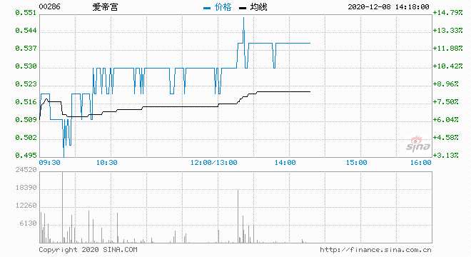 截至發(fā)稿,愛(ài)帝宮漲12.5%,報(bào)0.54港元,成交額1186.56萬(wàn)港元。