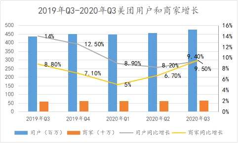 外賣業(yè)務(wù)GTV的高增長(zhǎng),得益于美團(tuán)商家和用戶取得雙向增長(zhǎng)。三季度,美團(tuán)商家為650萬,同比增長(zhǎng)9.5%;用戶為4.8億,同比增長(zhǎng)9.4%。