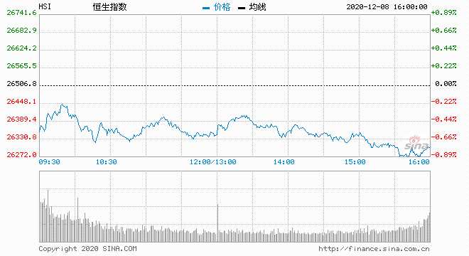 摘要: 恒生指數(shù)開(kāi)盤跌0.18%,全天震蕩下挫。截至收盤,恒生指數(shù)跌202.29點(diǎn)或0.76%,報(bào)26304.56點(diǎn),全日成交額達(dá)1354.18億。