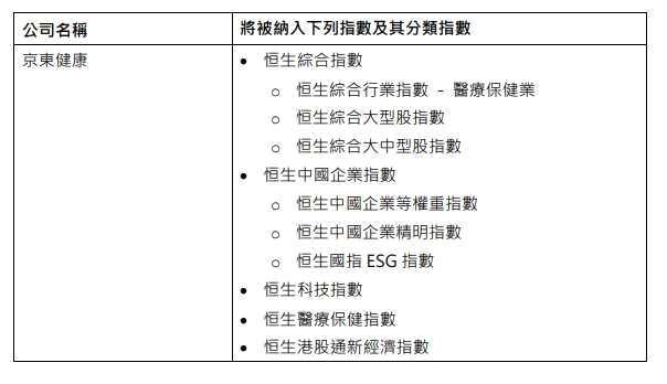 恒指公司:將京東健康(06618)納入恒生綜合指數(shù)等五大指數(shù)