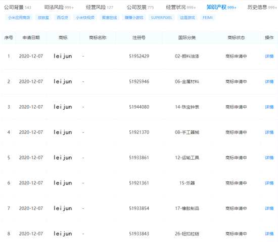 12月11日,天眼查顯示,近日,小米科技有限責(zé)任公司新增多條“l(fā)ei jun”商標(biāo)信息,涉及國際分類包含金屬材料、運(yùn)輸工具、樂器、珠寶鐘表等。申請日期為2020年12月7日。目前商標(biāo)狀態(tài)為“商標(biāo)申請中”。