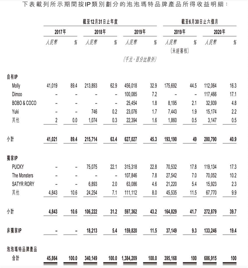 IP運營是泡泡瑪特的核心業(yè)務(wù)。截至2020年6月30日,泡泡瑪特運營93個IP ,包括12個自有IP 、25個獨家IP及56個非獨家IP 。目前,已有4個IP產(chǎn)生的累計收入分別超過人民幣1億元,同時,泡泡瑪特預(yù)計今年將推出超過30個新IP。