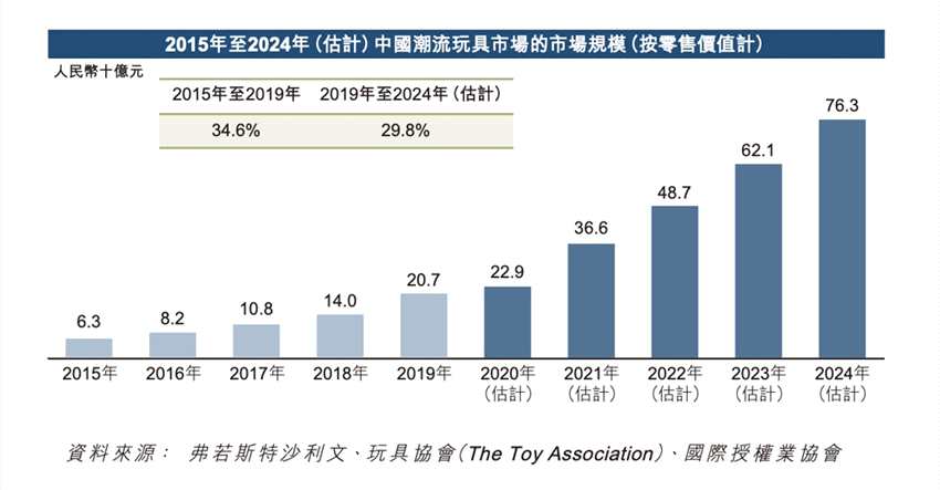 據(jù)弗若斯特沙利文報告數(shù)據(jù)顯示,全球的潮流玩具市場從2015年的87億美元增至2019年的198億美元,預(yù)計2024年將達(dá)418億美元。中國的潮玩市場從2015年的6.3億元增加至2019年的207億元,預(yù)計2024年將突破763億元。