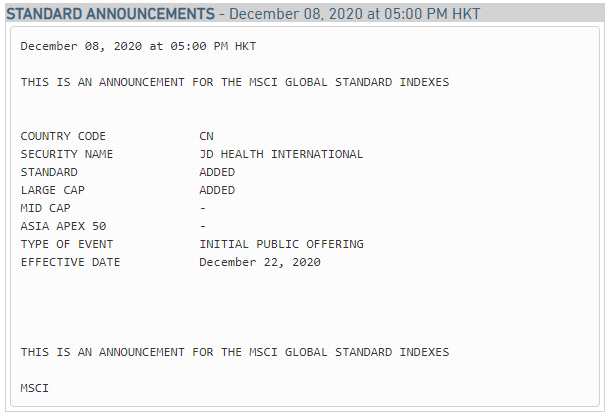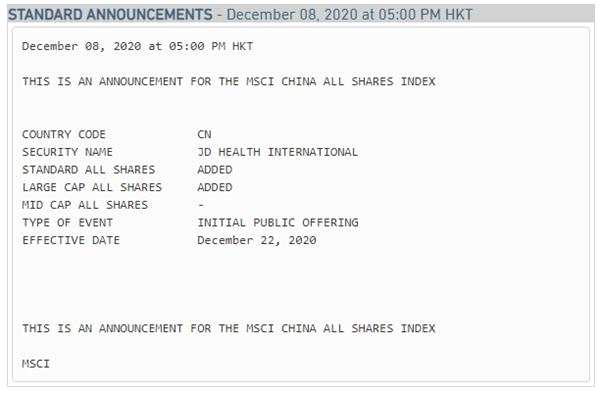 早在12月8日,富時(shí)羅素宣布將京東健康納入富時(shí)香港指數(shù),自2020年12月21日生效;MSCI宣布:將京東健康納入MSCI全球標(biāo)準(zhǔn)指數(shù)及大盤股指數(shù),同時(shí)納入MSCI中國(guó)全股票指數(shù),12月22日起生效。