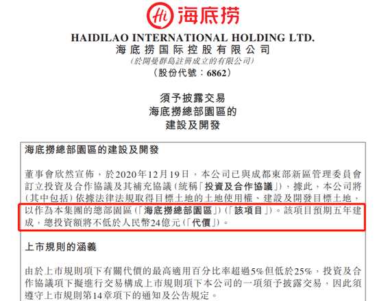 海底撈擬在成都建總部投資至少24億元 預(yù)期5年建成
