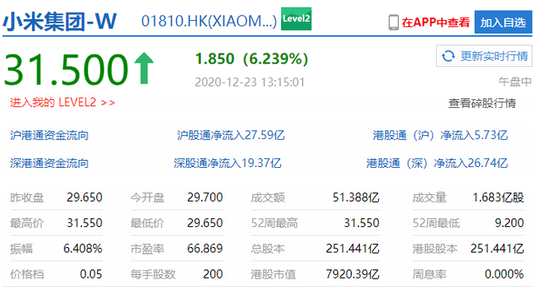 摘要: 查看最新行情新浪科技訊12月23日午間消息,港股小米集團(tuán)(01810.HK)午后漲幅擴(kuò)大至6.239%,報(bào)31.5港元,續(xù)刷紀(jì)錄高位。市值破7000億港元,達(dá)7920.39億。