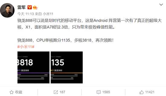 近期,小米迎來多重利好。12月22日,雷軍發(fā)微,小米11將于12月28日發(fā)布,雷軍還宣傳道,“驍龍888可以說是劃時代的移動平臺,這是Android 陣營第一次有了真正的超級大核,X1,面積是A78的2.3倍,只為帶來極致峰值性能。”