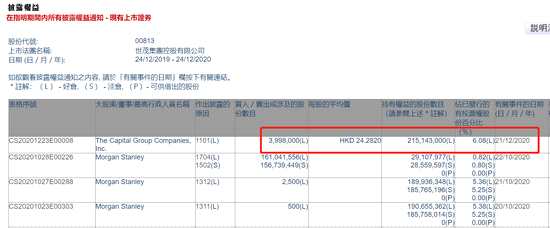 據(jù)港交所披露易,2020年12月21日,世茂集團(tuán)(00813.HK)獲The Capital Group Companies, Inc.(美國(guó)資本集團(tuán))在場(chǎng)內(nèi)以每股均價(jià)24.282港元增持399.8萬(wàn)股,涉資約9707.9萬(wàn)港元。增持后,The Capital Group Companies, Inc.最新持股數(shù)目為215,143,000股,持股比例由5.97%上升至6.08%。