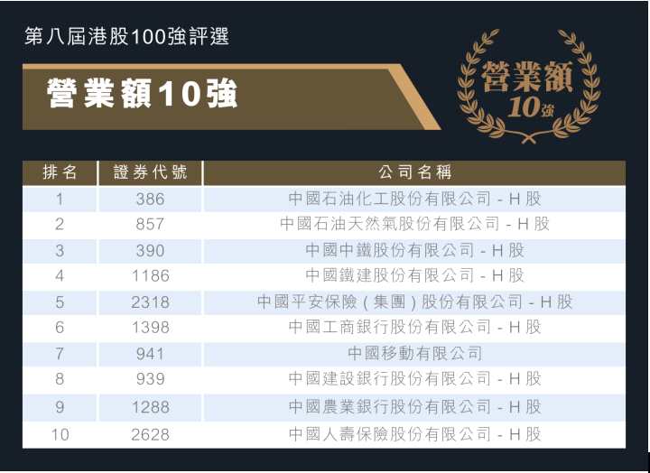 在今年的「港股100強(qiáng)」子榜單「營(yíng)業(yè)額10強(qiáng)」中,資源類龍頭巨擎中石化(00386-HK)和中石油(00857-HK)穩(wěn)居榜首與第二。