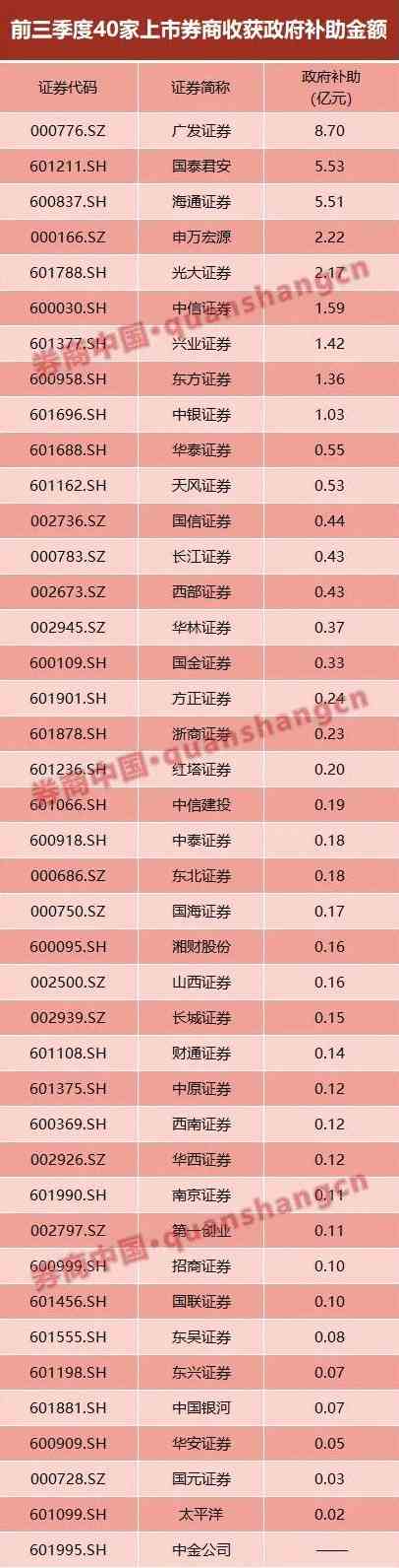 具體來看,今年前三季度,廣發(fā)證券拿到8.70億元補貼,國泰君安拿到5.53億元紅包,海通證券收獲5.5億紅包,申萬宏源和光大證券收到的補貼額度均超過2億元,中信證券、興業(yè)證券、東方證券、【中銀證券(601696)、股吧】等4家券商收獲的補貼超過1億元,即幾乎都是頭部券商拿到大紅包,合計已有9家券商的紅包額度過億元。