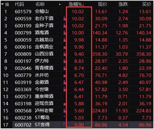 不過,前幾日連續(xù)調(diào)整的酒業(yè)股今天集體反彈,會稽山(601579,股吧)、老白干酒(600559,股吧)、金種子酒(600199,股吧)、酒鬼酒(000799,股吧)、古越龍山(600059,股吧)等多股漲停,其中酒鬼酒等股票還創(chuàng)下歷史新高。