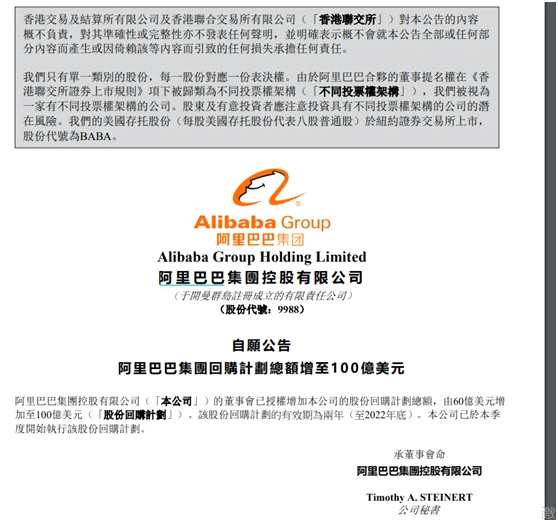 阿里巴巴今日早間公告,公司董事會已授權(quán)增加公司的股份回購計(jì)劃總額,由60億美元增加至100億美元。該股份回購計(jì)劃的有效期為兩年(至2022年底)。公司已于本季度開始執(zhí)行該股份回購計(jì)劃。