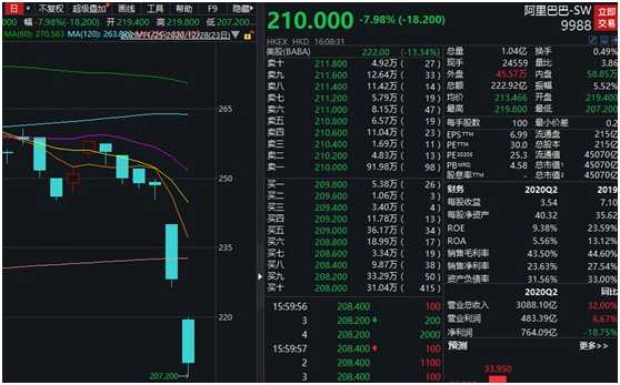 阿里巴巴港股再次重挫,收盤下跌7.98%,目前僅報210港元。上周五,阿里巴巴港股大跌8.13%。今年10月28日,阿里巴巴港股一度達(dá)到309.40元,創(chuàng)下上市以來新高。目前股價較高位已下跌超過30%。