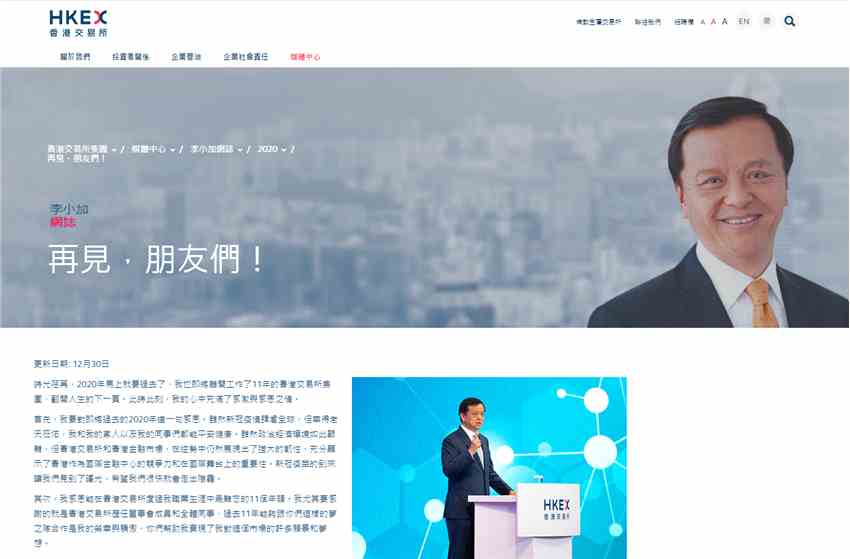 12月30日,港交所網(wǎng)站發(fā)布了李小加的文章——《再見,朋友們!》