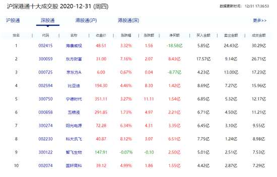 12月31日消息,北上資金今日凈流入30.78億。東方財富(300059,股吧)凈買入8.43億,科大訊飛(002230,股吧)凈買入6.51億,陽光電源(300274,股吧)凈買入3.35億,智飛生物(300122,股吧)凈買入2.50億。