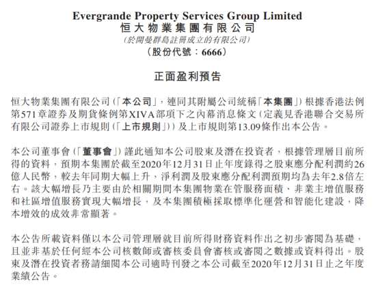 摘要: 恒大物業(yè)(06666.HK)發(fā)布公告,預(yù)期本集團于截至2020年12月31日止年度錄得之股東應(yīng)分配利潤約26億元人民幣,較去年同期大幅上升,凈利潤和歸屬股東凈流潤均為去年2.8倍左右。