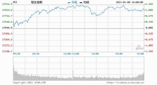 1月8日消息,美股周四收高,三大股指均創(chuàng)盤中與收盤歷史新高,納指史上首次突破13000點關(guān)口。港股恒指昨日受科技股拖累,全天跌超0.5%,今日早盤,港股恒指高開高走,高見27921點,午后漲幅有所收窄。截至收盤,恒指漲1.2%,報27878.22點;國企指數(shù)漲1.47%,紅籌指數(shù)漲1.4%。