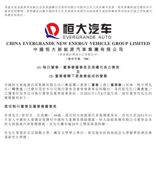 摘要: 昨日,中國恒大新能源汽車港交所公告,時守明先生已辭任其于本公司執(zhí)行董事及董事會董事長的職位,肖恩先生已獲委任為本公司執(zhí)行董事及董事會董事長,自1月8日起生效。
