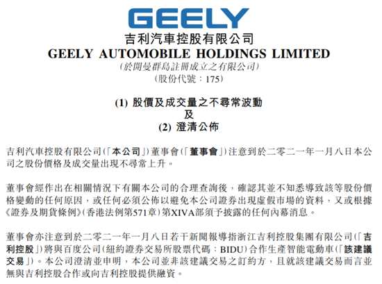 摘要: 1月11日消息,吉利汽車表示不知悉1月8日股價不尋常變動原因。董事會亦注意到1月8日若干新聞報道指吉利控股將與百度公司合作生產智能電動車(‘該建議交易’)。