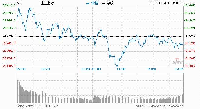 摘要: 恒生指數(shù)開(kāi)盤(pán)漲0.12%,全天窄幅震蕩。截至收盤(pán),恒生指數(shù)跌41.15點(diǎn)或0.15%,報(bào)28235.6點(diǎn),全日成交額達(dá)2021.35億。