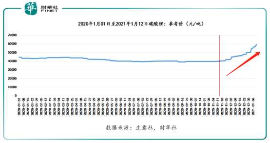 據(jù)市場數(shù)據(jù)顯示,截至2021年1月12日,電池級碳酸鋰價格報價在58000-62000元/噸之間,均價為60000元/噸,較上一日漲價1000元。因此,根據(jù)現(xiàn)階段供需關(guān)系,預(yù)計2021年一季度碳酸鋰價格或?qū)⒕S持強(qiáng)勢。