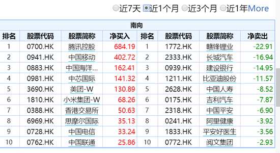 近1個(gè)月來,騰訊獲買入684.19億,中國移動(dòng)超400億,美團(tuán)、中海油、中芯國際、小米、港交所等上榜。