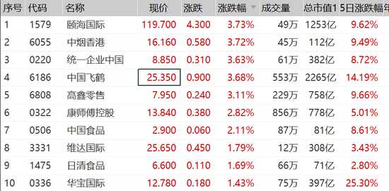 消費(fèi)股走高,頤海國際、中煙香港等漲近4%,中國飛鶴、高鑫零售等集體走高。