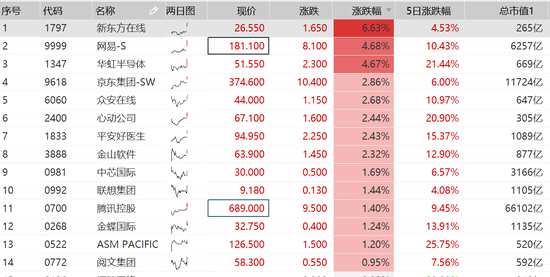 截至發(fā)稿,科技股走勢分化,新東方在線漲超6%,網(wǎng)易、華虹半導(dǎo)體漲超4%,騰訊收窄至1.4%。丘鈦科技、微盟等大跌超4%。